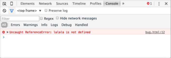 Endi biz xatolarni ko’rishimiz mumkin va bu boshlash uchun etarli. Biz keyinchalik dasturchilar uchun vositalariga qaytamiz va Chrome da koddagi nosozliklarni tuzatish bo’limida debugging (dastur kodidagi xatolarni topish va tuzatish) ni batafsil ko’rib chiqamiz.