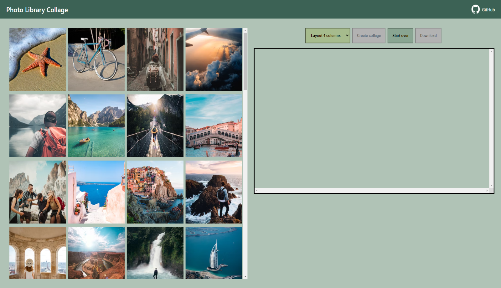 On the left side, there is a cloud library of photos (they are displayed as thumbnails). We can select the images we need and create a collage, by clicking the "Create collage" button on the right side of the page. Then, the resulting collage can be downloaded as an image.