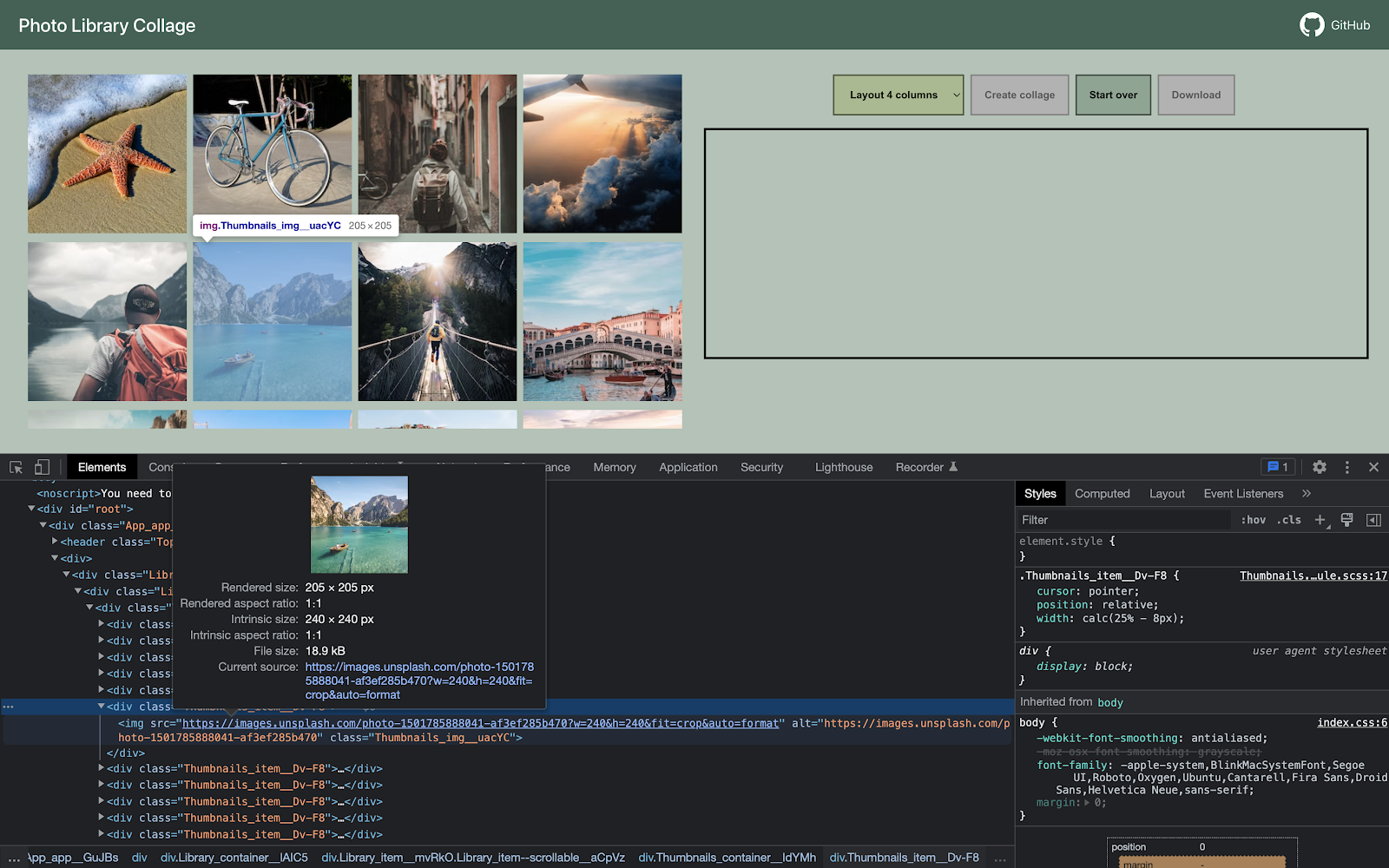 Below, we can see, that the intrinsic size of the thumbnails is 240x240 pixels. The size was chosen on purpose to increase loading speed. Moreover, we do not need full-size photos in preview mode.