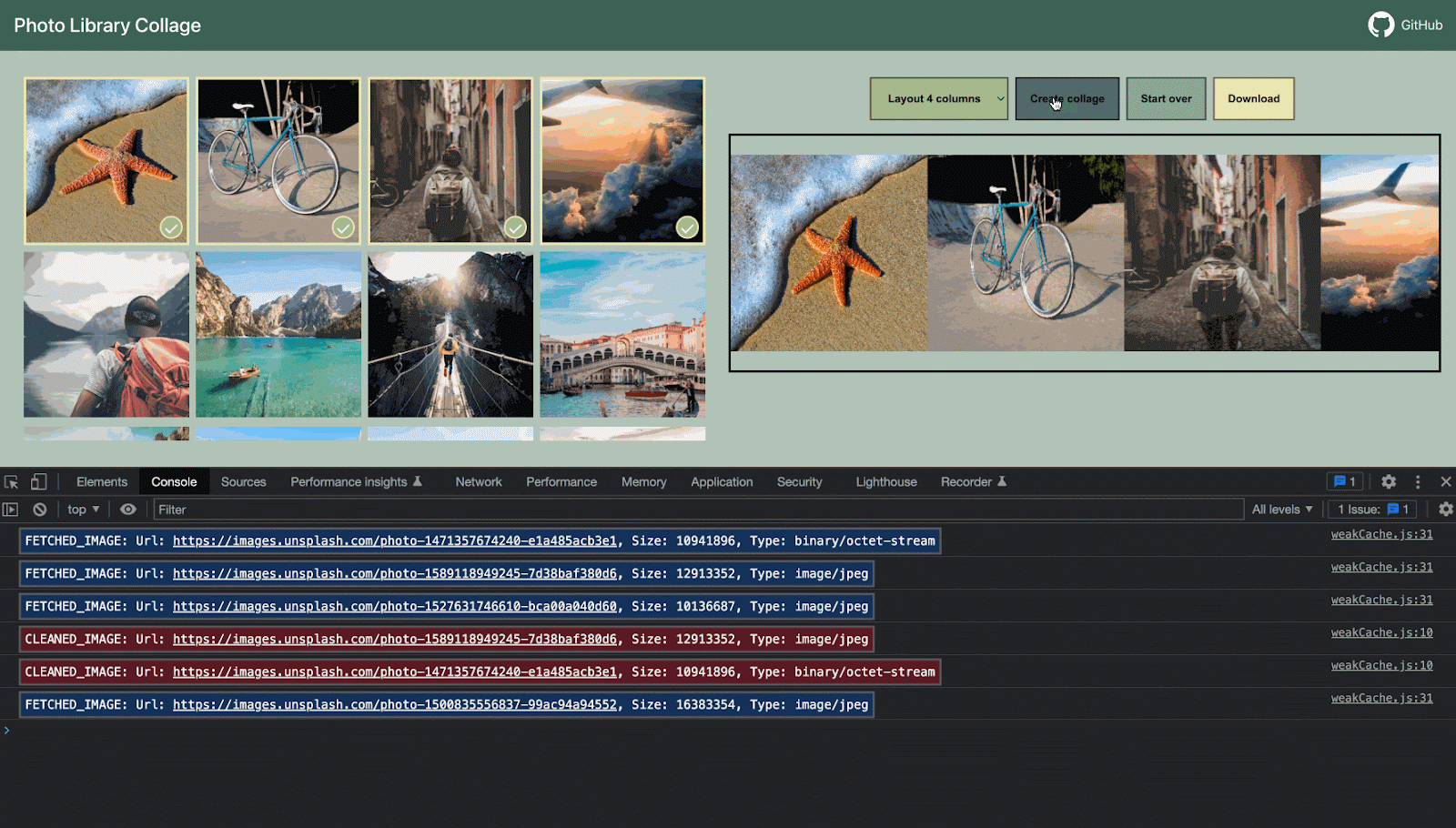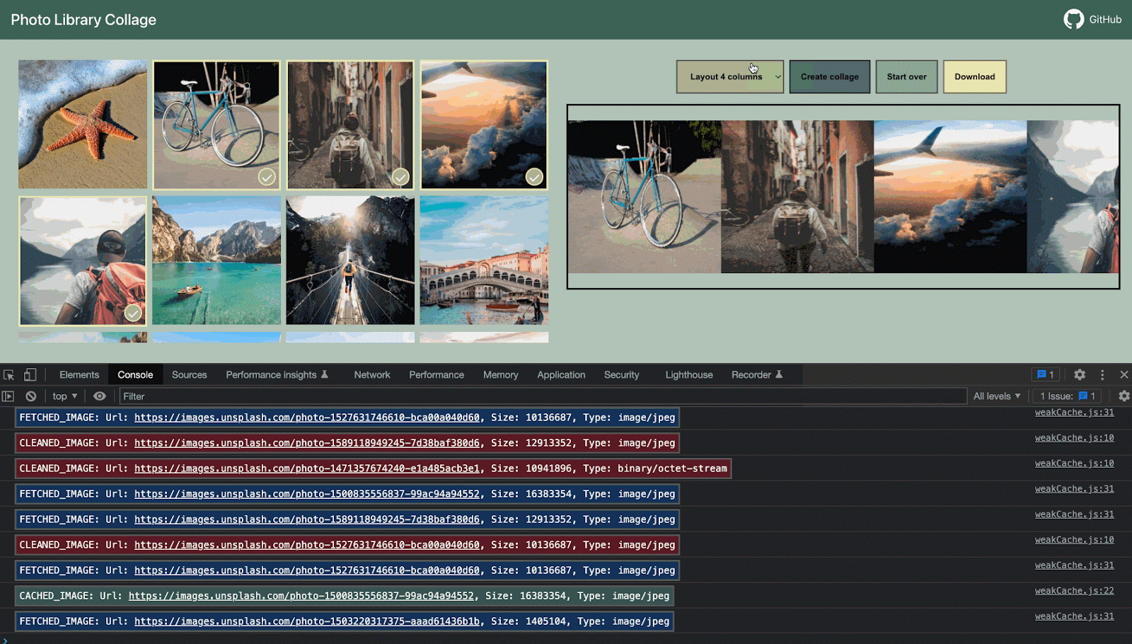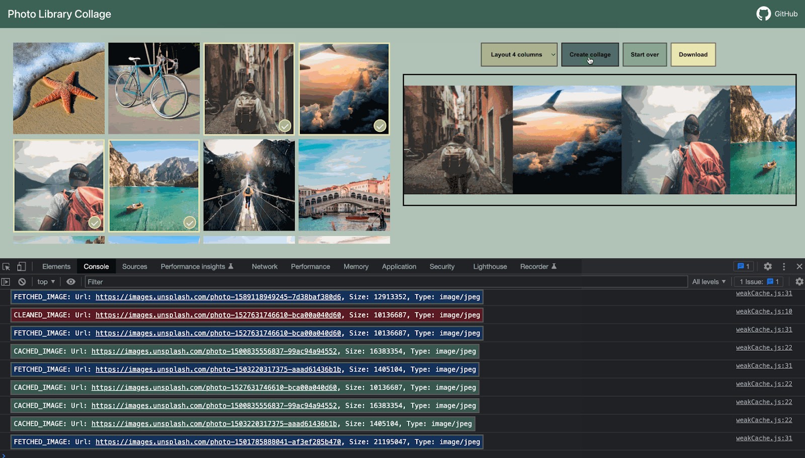 Paying attention to the output in the console, you can see, which of the photos were downloaded from the cloud – this is indicated by FETCHED_IMAGE. Since this is the first attempt to create a collage, this means, that at this stage the “weak cache” was still empty, and all the photos were downloaded from the cloud and put in it.